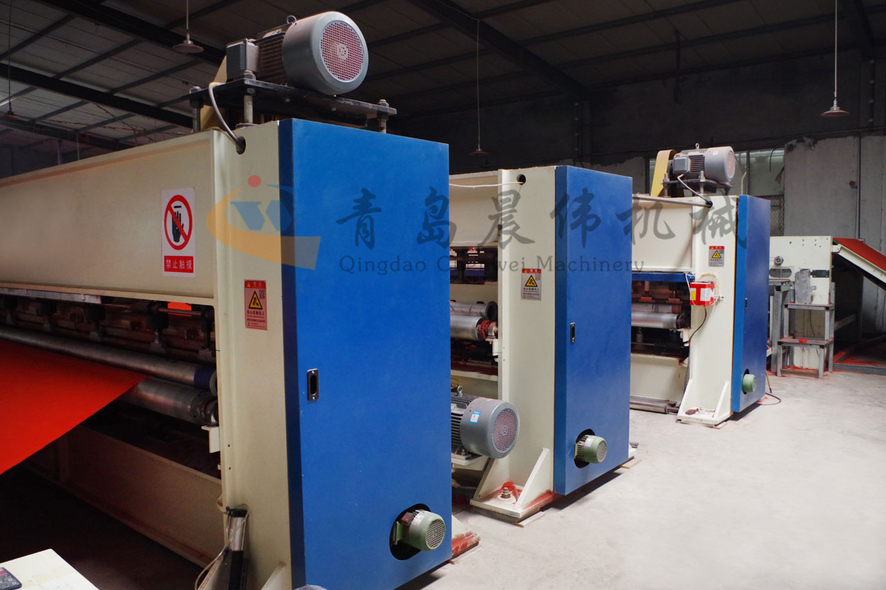 5. CWPW-鋪網(wǎng)機:用于將梳理纖網(wǎng)通過移動小車交叉折疊為所需幅寬和定量的多層纖網(wǎng),以供后道工序使用。鋪網(wǎng)輥采用特殊結(jié)構,加裝壓網(wǎng)輥和導流板,不飄網(wǎng)不起皺,五只大功率電機精確控制各部件的運動,電動輸出簾高度調(diào)節(jié)裝置