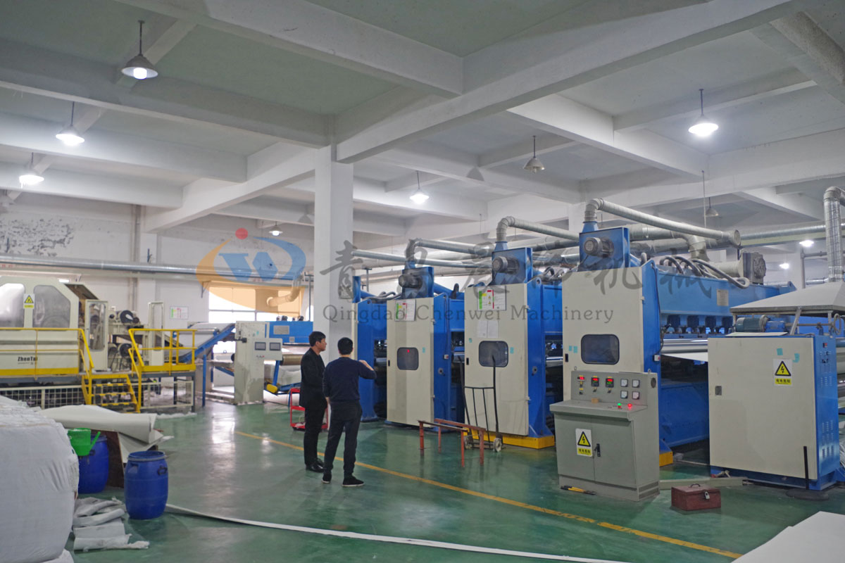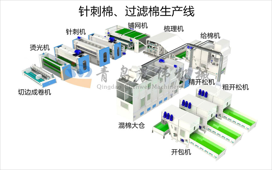 開(kāi)包機(jī)-開(kāi)松機(jī)-振動(dòng)給棉機(jī)-梳理機(jī)-鋪網(wǎng)機(jī)-針刺機(jī)-切邊成卷機(jī)